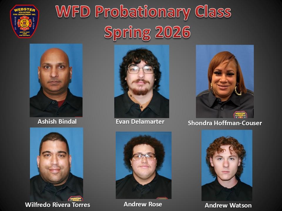Probationary firefighters Ashish Bindal, Evan Delamarter, Shondra Hoffman-Couser, Wilfredo Rivera Torres, Andrew Rose, and Andrew Watson will complete several months of instruction under the supervision of Captain Mike Burdick and WVFD peer trainers. After finishing their recruit training, the new firefighters will join the Webster Volunteer Fire Department as exterior personnel. They will then be required to attend additional training at the Monroe County Public Safety Training Facility to become eligible for interior firefighting duties.
